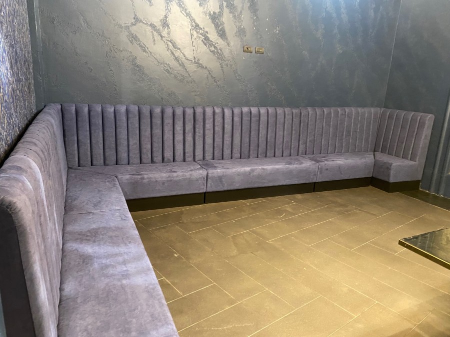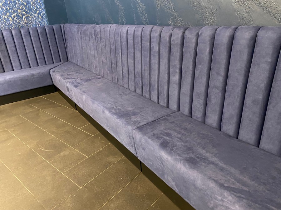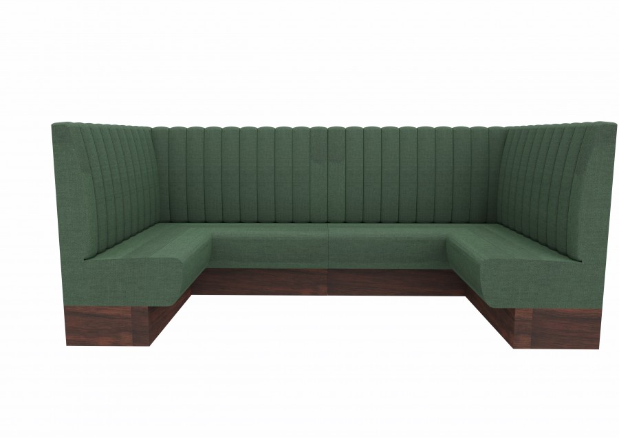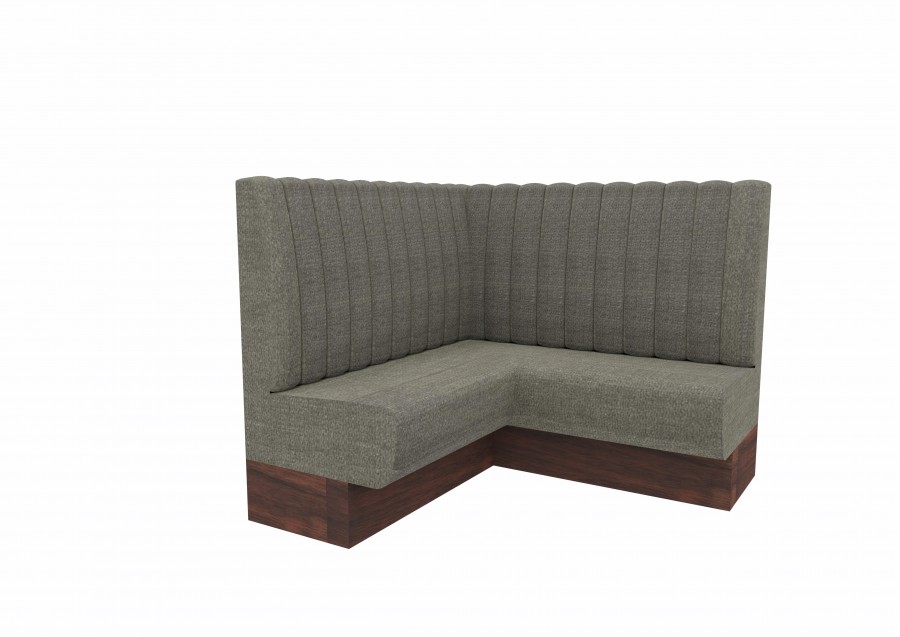 Divanetto modulare con schienale a coste, seduta liscia e basamento con balza chiusa. Modulo angolare.