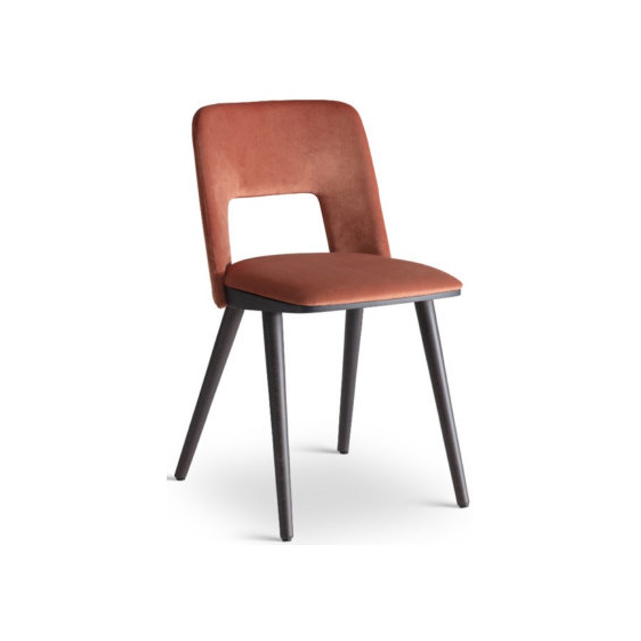 Sedia con struttura in faggio verniciata in diverse finiture, seduta e schienale rivestiti con foro fra seduta e schienale.