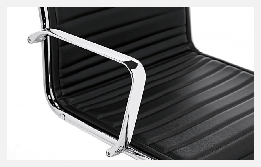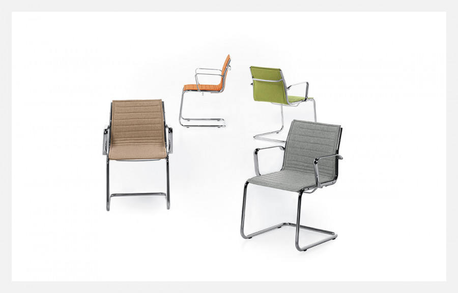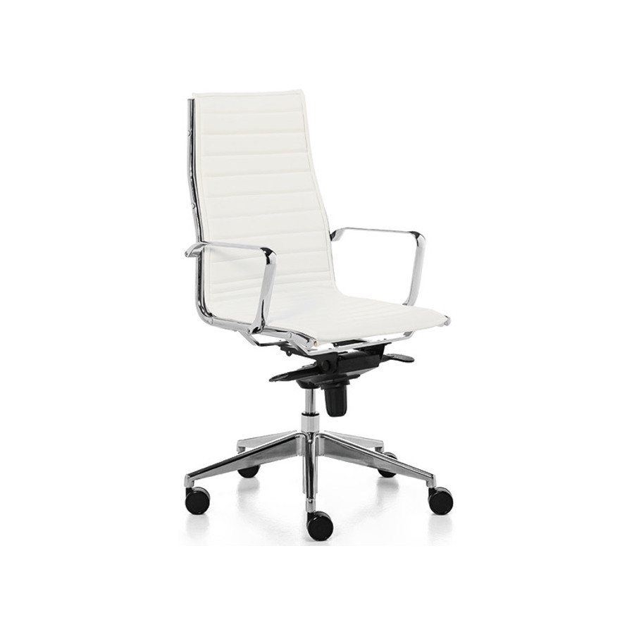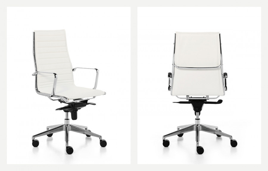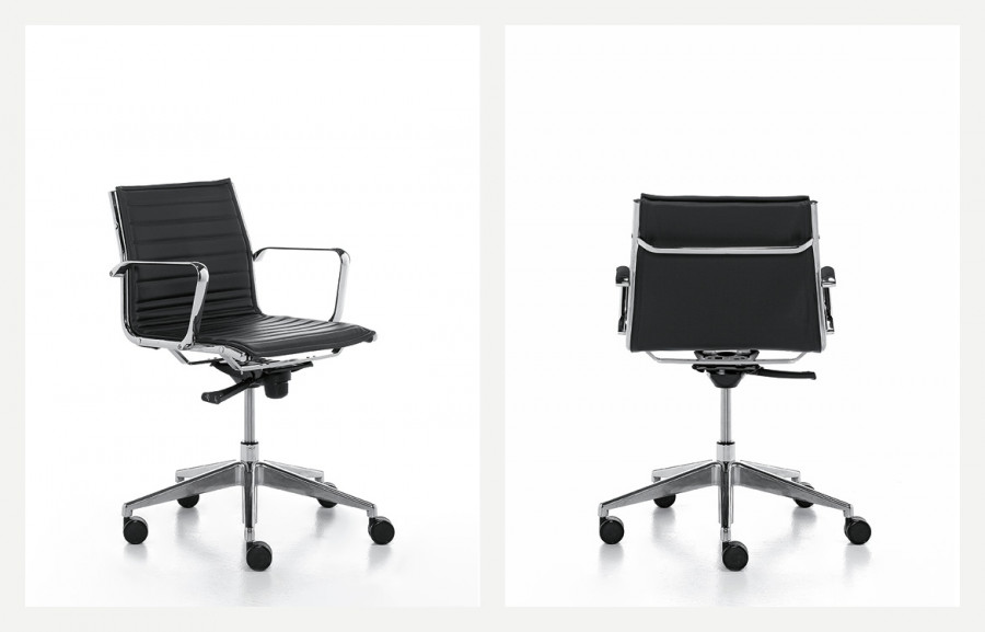 Poltrona direzionale classica con struttura in acciaio arricchita da particolari in alluminio pressofuso. Una leggera imbottitura a cuciture orizzontali evidenzia lo stile elegante e moderno. Disponibile in due altezze di schienale. Completa la collezione la sedia da attesa con struttura fissa a slitta.