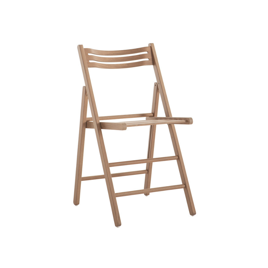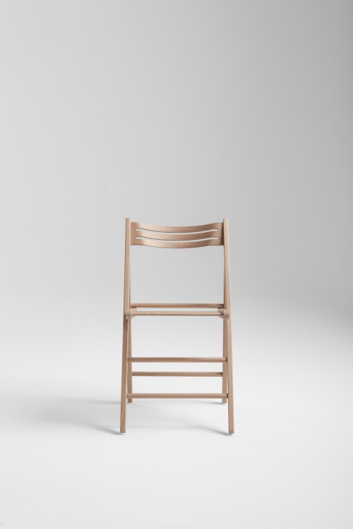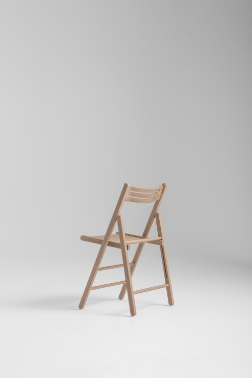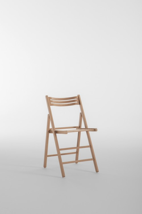 Sedia pieghevole con struttura realizzata in legno di faggio massello con fresate orizzontali sullo schienale e giunti a scomparsa.