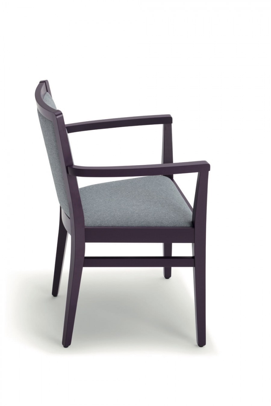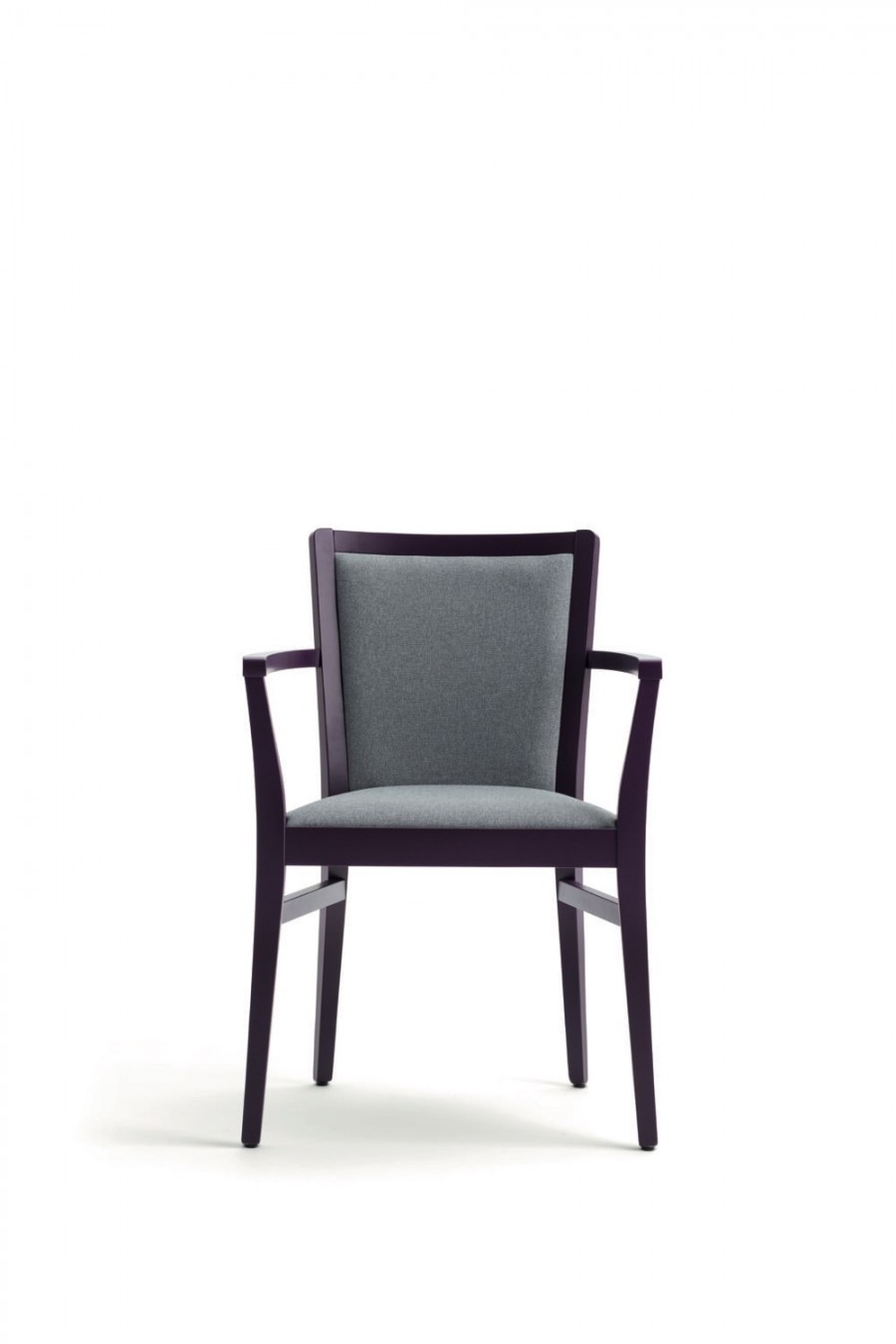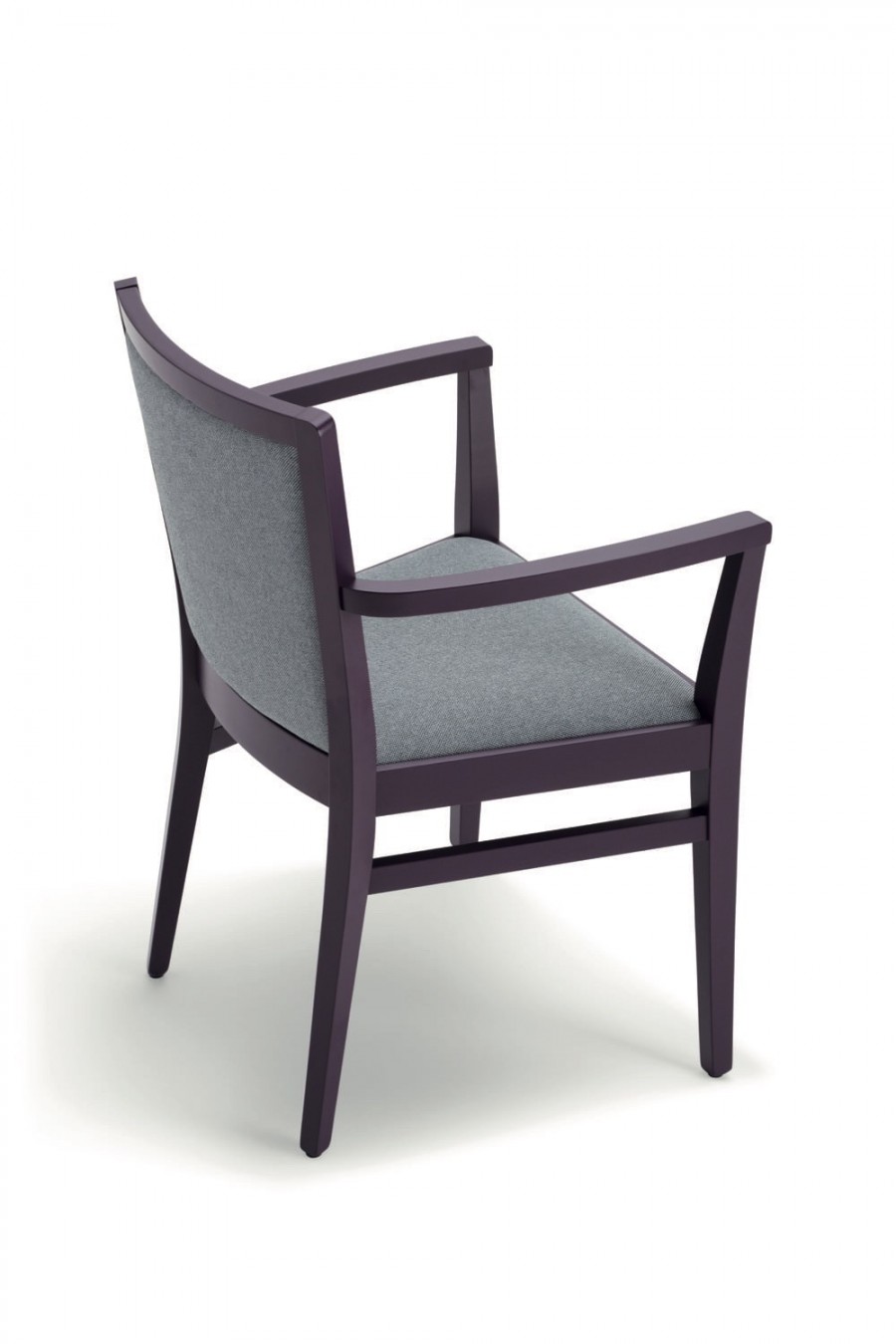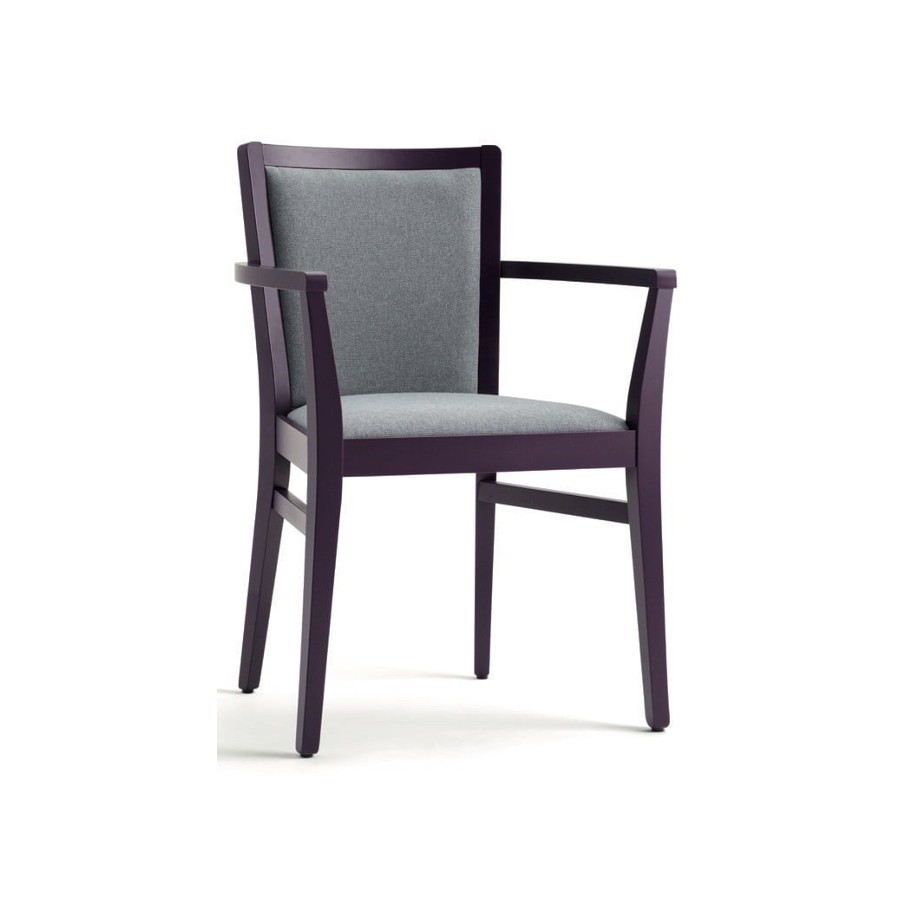 Poltrona in legno di faggio con seduta e schienale rivestito.