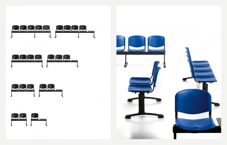 Una collezione di panche con sedute e schienali in polipropilene, in cui la resistenza e la pulibilità delle superfici sono i requisiti fondamentali.