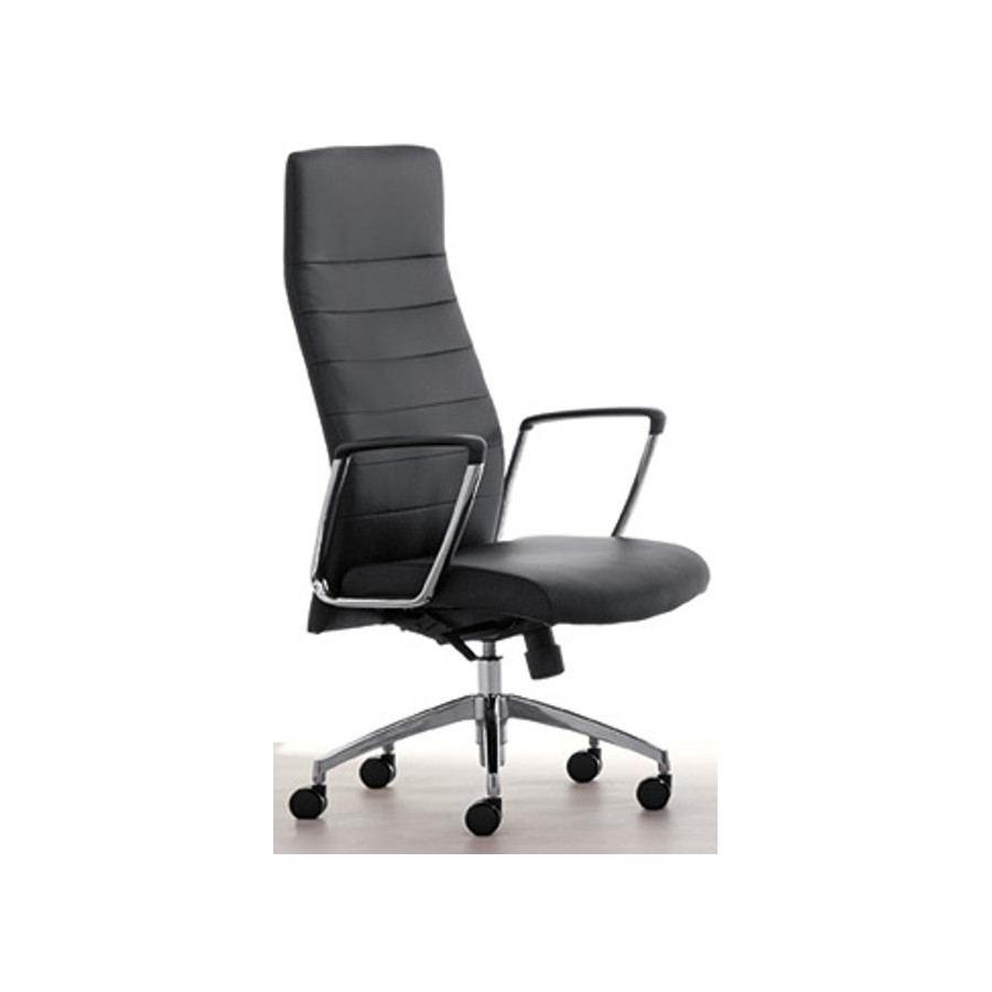 Poltrona direzionale dalle proporzioni slanciate e snelle. Il rivestimento a fasce orizzontali e il bracciolo fisso ad anello la rendono elegante e moderna. Il meccanismo è sincronizzato multi-blocco ed elevazione a gas.