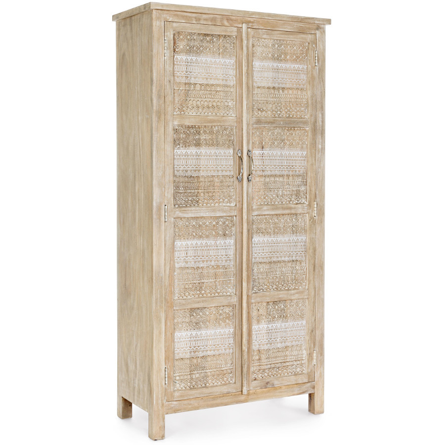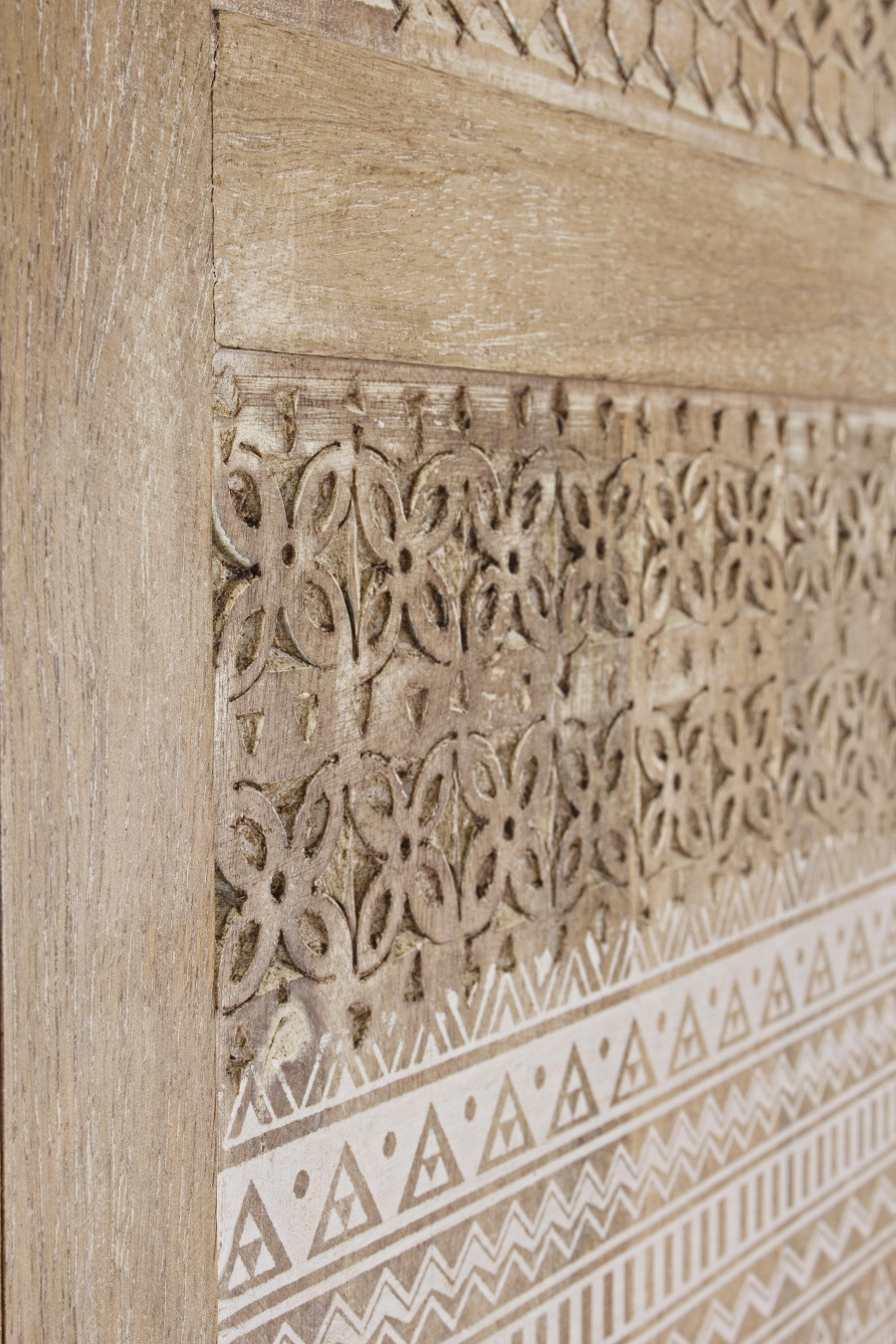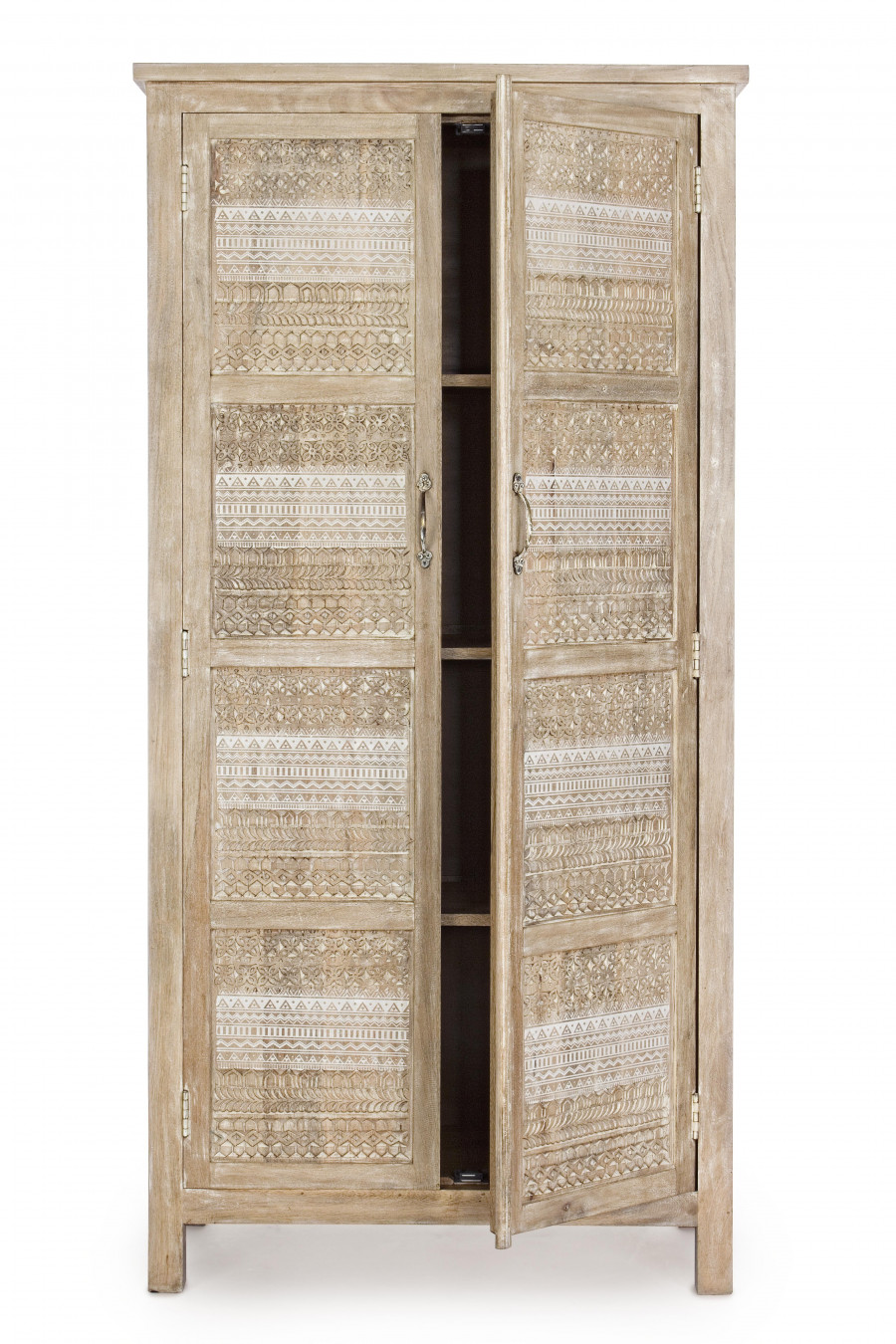 Mobile con struttura in legno di mango con decorazioni intarsiate a mano, schienale e fondo cassetti in mdf. finitura a base di nitrocellulosa. vano porta comprensivo di mensola. maniglie e pomelli in ottone.