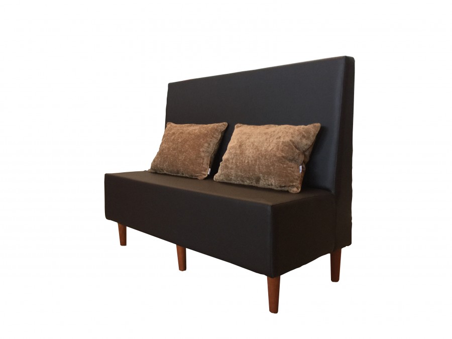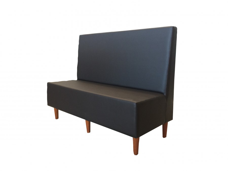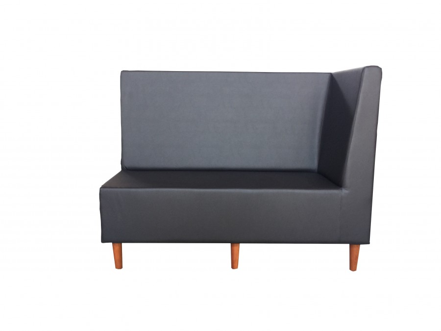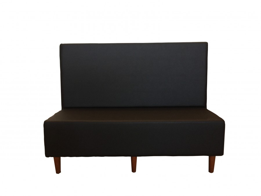 Divanetto modulare con schienale e seduta liscia e basamento con bambe in legno coniche.